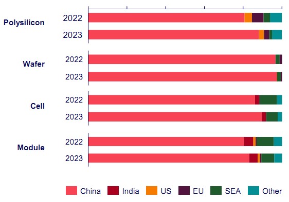 چین در سال ۲۰۲۳ تسلط خود بر زنجیره تامین پنلها را محکمتر کرد و سهمش را به بیش از ۸۰ درصد رساند