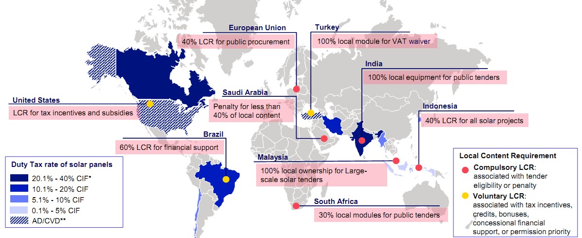 وضعیت LCR (نقاط قرمز: LCR اجباری، نقاط زرد: LCR اختیاری) و نرخ عوارض پنلهای خورشیدی (راهنمای سمت چپ شکل) در کشورهای مختلف