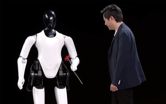 ربات انساننمای دوپای شیائومی پس از آنکه نامش آمد، به “لی جون”، مدیر عامل و رئیس هیئت مدیره شرکت شیائومی روی صحنه ملحق شد و به مدیرعامل خوش آمد گفت و یک گل به او داد.