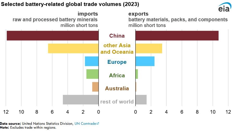 به گزارش eia، طبق داده‌های سازمان ملل متحد، این کشور در سال ۲۰۲۳ تقریبا ۱۱ میلیون تن مواد معدنی خام و فراوری شده مرتبط با ساخت باتری را وارد کرده است که ۴۴ درصد از کل تجارت بین منطقه‌ای این مواد را تشکیل می‌دهد، و حدود ۱۰ میلیون تن مواد اولیه، باتری‌های کامل و قطعات باتری را نیز صادر نموده که معادل ۵۸ درصد از کل حجم تجارت بین منطقه‌ای این اقلام بوده است.