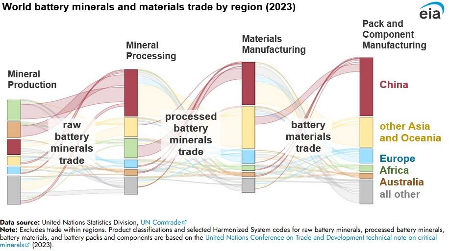 چین نقش مهمی در تمام مراحل زنجیره تامین جهانی باتری ایفا می‌کند و بر تجارت بین منطقه‌ای مواد معدنی تسلط دارد.