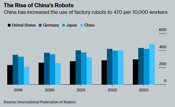 استراتژی چین، یکپارچهسازی رباتهای انساننما در بخشهایی چون تولید، بهداشت و درمان و خدمات مهمانداری است. کارخانههای چین هماکنون از تراکم رباتی برخوردارند که از آلمان و ژاپن نیز پیشی گرفته و تنها در چهار سال دو برابر شده است. بنا بر دادههای فدراسیون بینالمللی رباتیک، چین در سال ۲۰۲۳ به ازای هر ۱۰ هزار کارگر، ۴۷۰ ربات در اختیار داشت؛ در حالی که این عدد برای ایالات متحده ۲۹۵ ربات بود.